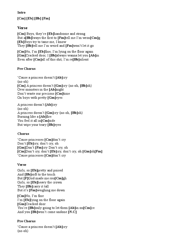 . I always want to let you in. Download English songs online from JioSaavn. Cause princesses dont cry Dont cry dont cry oh Dont cry Dont cry oh Dont cry dont cry dont cry oh Cause princesses dont cry Girls so pretty and poised And soft to the touch But God made me rough Girls so heavy the crown They carry it tall But its weighing me down No Im fine Im lying on the floor again Cracked door.